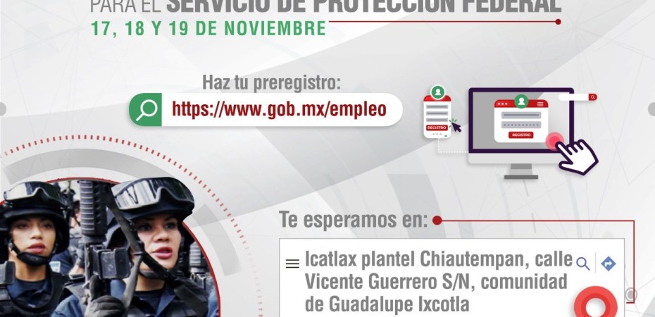 Los interesados en las vacantes del SPF pueden postularse en el Portal del Empleo https://www.gob.mx/empleo, donde se establecerá fecha y hora de su entrevista presencial, la cual tendrá lugar en las instalaciones del Icatlax plantel Chiautempan, ubicado en la calle Vicente Guerrero S/N, en la comunidad de Guadalupe Ixcotla, con un horario de 9:00 a 17:00 horas.