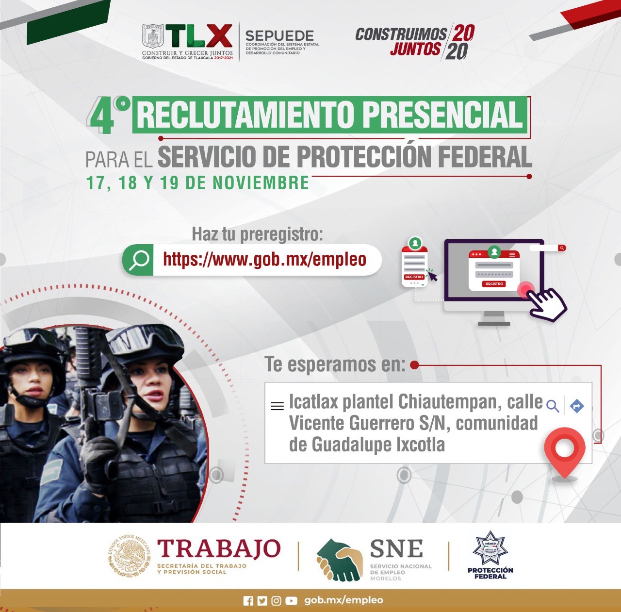 El Sistema Estatal de Promoción del Empleo y Desarrollo Comunitario (Sepuede), a través del Servicio Nacional del Empleo (SNE), realizará del 17 al 19 de noviembre el Cuarto Reclutamiento Presencial para ampliar las capacidades del Servicio de Protección Federal (SPF), organismo desconcentrado de la Secretaría de Seguridad y Protección Ciudadana (SSPC).