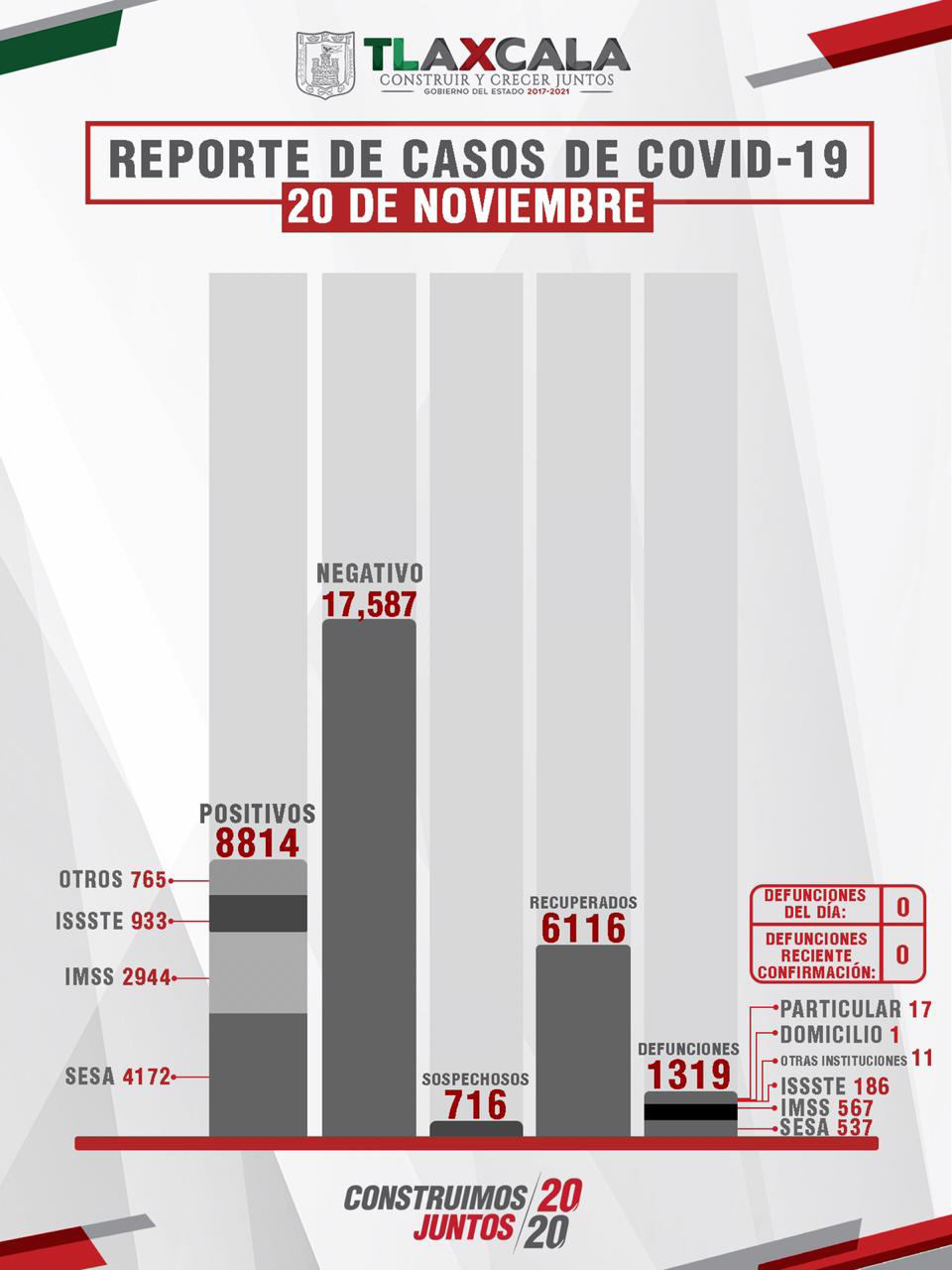 De acuerdo con el reporte del 20 de noviembre, la Secretaría de Salud del Estado (SESA) dio a conocer que no se reportaron defunciones por Covid-19 en la entidad, y confirmó 8 personas recuperadas y 9 casos positivos de tlaxcaltecas identificados en el estado y dos en otras entidades.