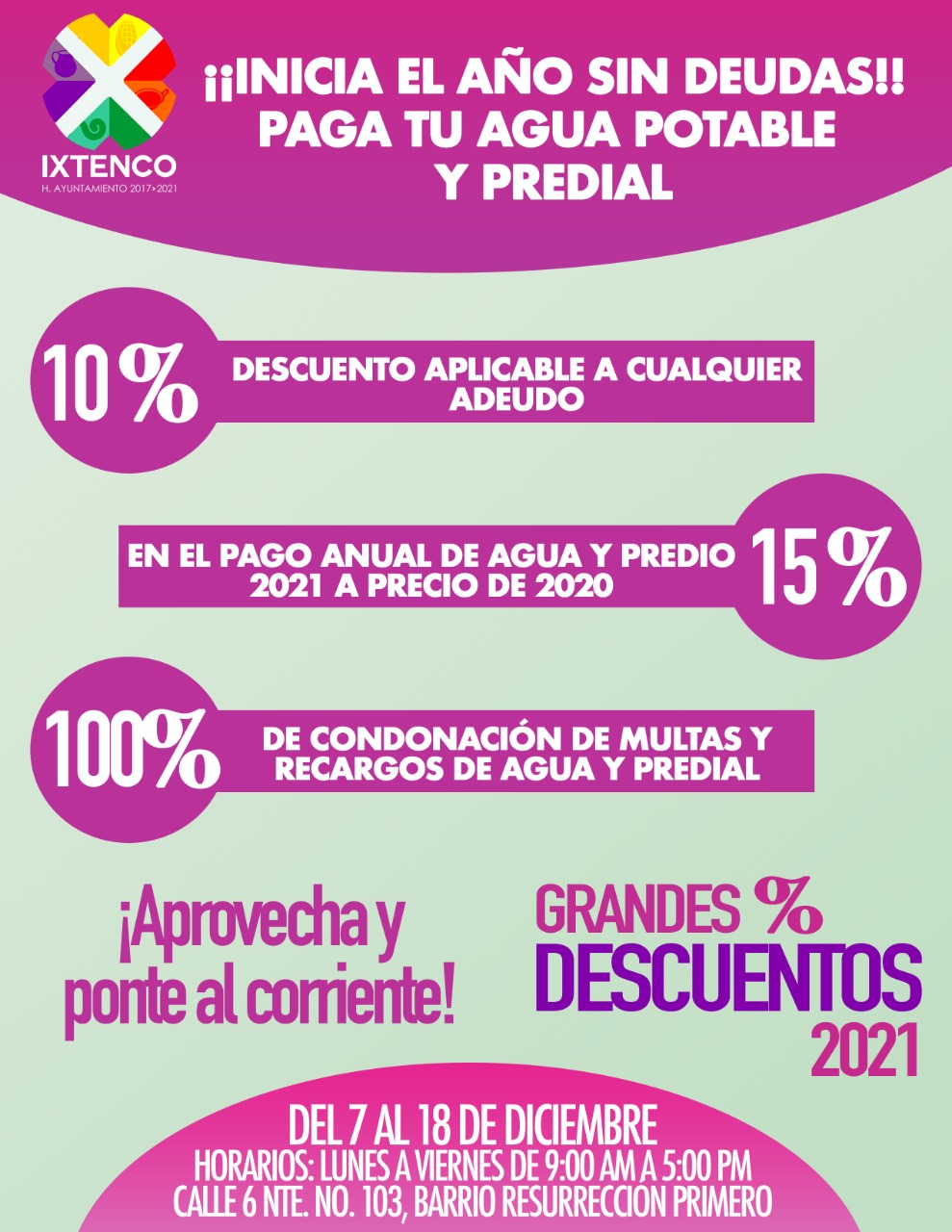 Finalmente dijo que se dará el 10 por ciento de descuento aplicable a cualquier adeudo, y el 15 por ciento en el pago anual 2021 de agua potable y predio a precio de 2020, y la condonación del 100 por ciento en multas y recargos.
