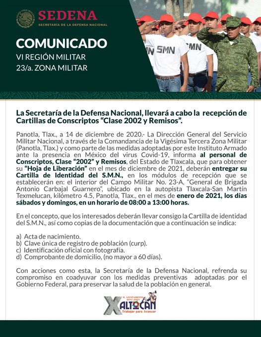 En el comunicado se hace notar “como parte de las medidas adoptadas por este Instituto Armado ante la presencia en México del virus Covid-19, informa al personal de Conscriptos, Clase «2002» y Remisos del Estado de Tlaxcala, que para obtener su “Hoja de Liberación» en el mes de diciembre de 2021, deberán entregar su Cartilla de Identidad del S.M.N., en los módulos de recepción que se establecerán en: el interior del Campo Militar No. 23-A, «General de Brigada Antonio Carbajal Guarnero», ubicado en la autopista Tlaxcala-San Martin Texmelucan, kilómetro 4.5, Panotla, Tlax., en el mes de enero de 2021, los días sábados y domingos, en un horario de 08:00 a 13:00 horas”.
