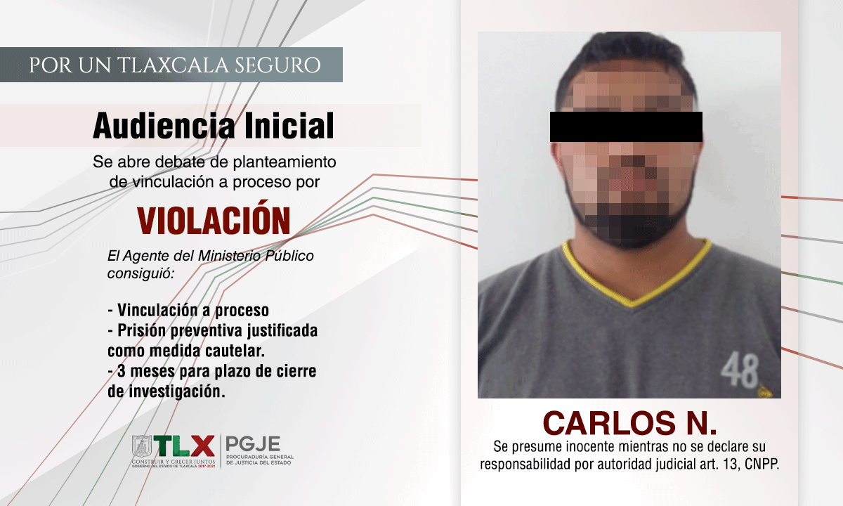 Resultado del trabajo coordinado de agentes del Ministerio Público, peritos y oficiales de la Policía de Investigación, la Procuraduría General de Justicia del Estado (PGJE) logró la vinculación a proceso de Juan Carlos N., por el delito de violación en agravio de su sobrina menor de edad.