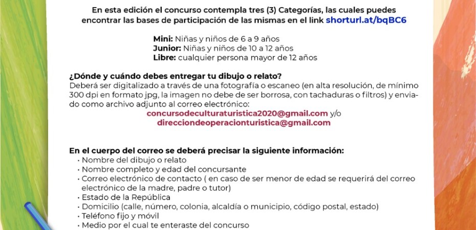 La recepción de dibujos o relatos será hasta el 31 de marzo de 2021, para mayor información los interesados pueden consultar la convocatoria a través de la página oficial del concurso https://www.gob.mx/ictur/articulos/concurso-nacional-de-cultura-turistica-2020?idiom=es.