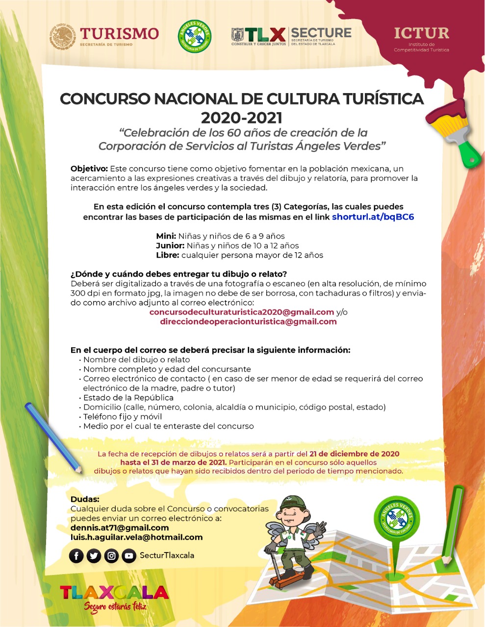 La Secretaría de Turismo del Estado (Secture) invita a participar en el Concurso Nacional de Cultura Turística 2020, que realiza la Secretaría de Turismo Federal con motivo de la “Celebración de los 60 años de la creación de la Corporación de Servicios a Turistas Ángeles Verdes”.