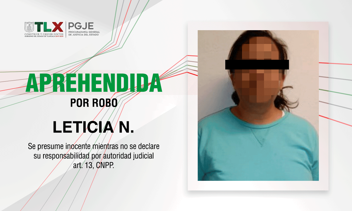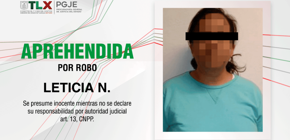 La Procuraduría General de Justicia del Estado de Tlaxcala (PGJE) y la Fiscalía General del Estado de Puebla (FGE), lograron la aprehensión de Leticia N., por su probable responsabilidad en el robo a la Notaría Pública ubicada en el municipio de Huamantla.