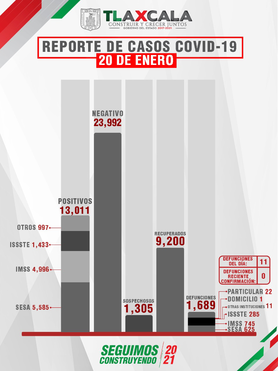 De acuerdo con el reporte del 20 de enero, la Secretaría de Salud del Estado (SESA) confirmó 78 personas recuperadas, 11 fallecimientos y 109 casos positivos de Covid-19 de tlaxcaltecas identificados en el estado y 9 en otras entidades.
