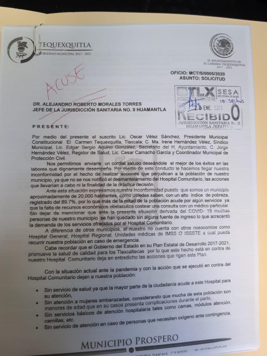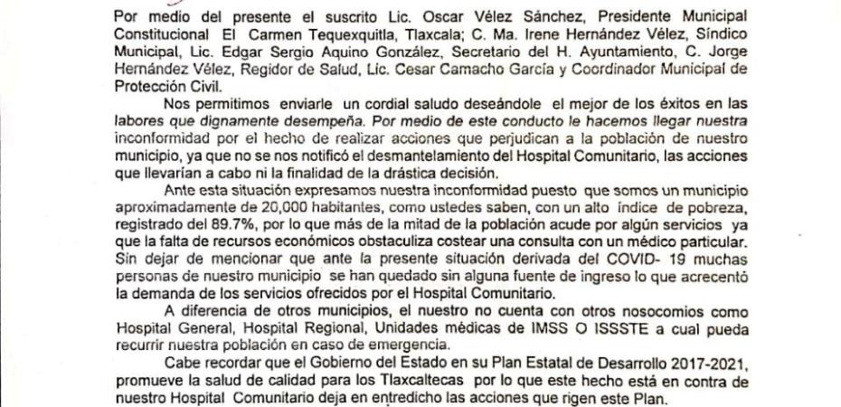 Por medio de un escrito con destino al Gobernador del Estado de Tlaxcala Marco Antonio Mena Rodriguez, al Secretario de Gobierno José Aarón Pérez Carro, al Secretario de Salud y Director General del O.P.D. Salud Tlaxcala Rene Lima Morales y al Dr. Alejandro Roberto Morales Torres Jefe de la Jurisdicción Sanitaria No. II de Huamantla; el presidente municipal de Tequexquitla Óscar Vélez Sánchez, presentó su inconformidad por la decisión que tomaron de desmantelar el Hospital Comunitario de su municipio perjudicando a la población que encabeza.A través del oficio, el municipe mencionó al gobernador del estado que su Plan de Desarrollo 2017-2021 promueve la salud de calidad para los Tlaxcaltecas por lo que este hecho está en contra dejando en entredicho las acciones que lo rigen.