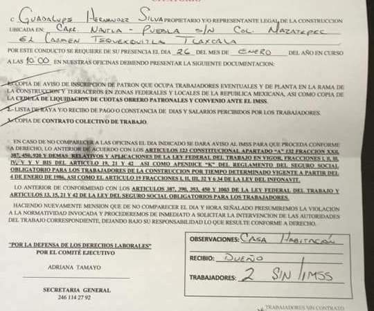 Mediante una denuncia anónima, se dio a conocer un documento de un sindicato de Apizaco que estafaba a los constructores del municipio.