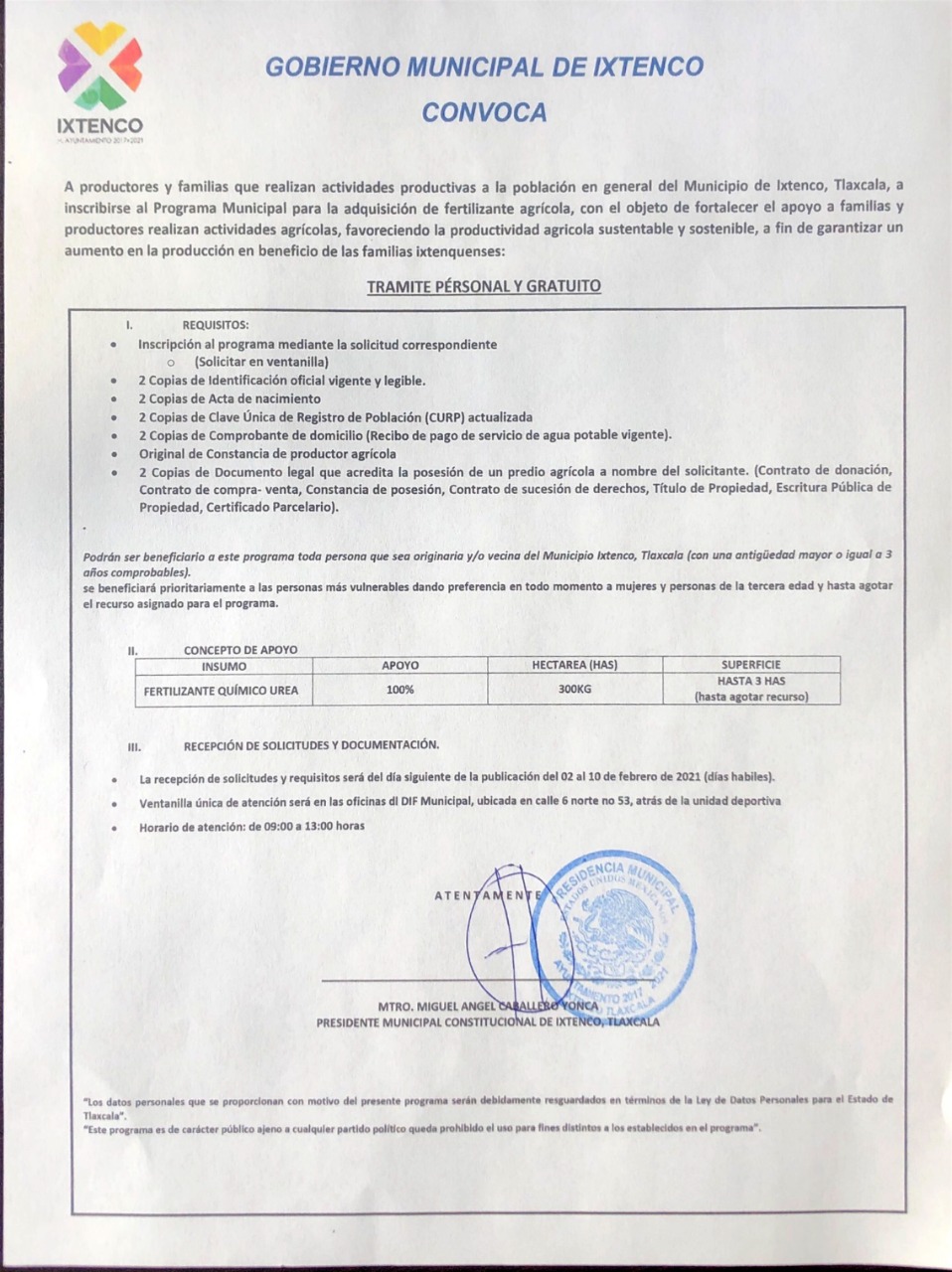El Gobierno Municipal de Ixtenco, que encabeza Miguel Ángel Caballero Yonca, anunció que en unos días se abrirán las ventanillas de atención, para entregar la documentación para poder acceder el Programa de Fertilizante Gratuito.