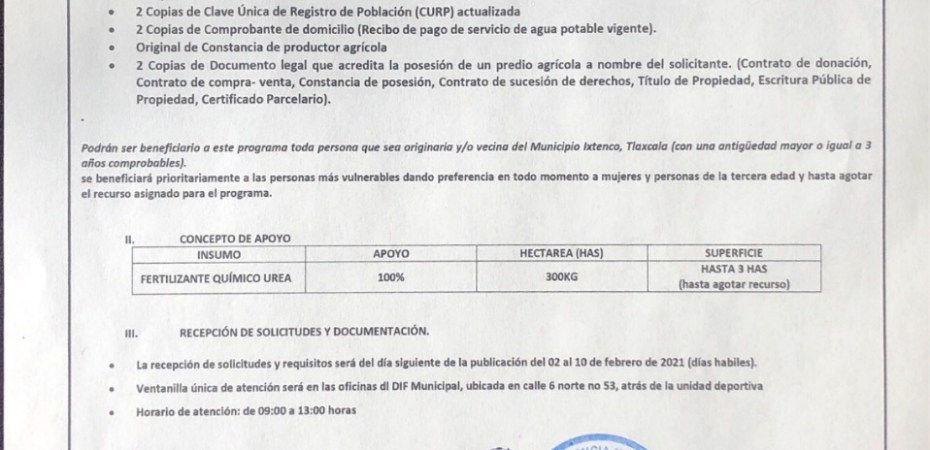 Los que quieran acceder a este apoyo, deberán acudir a la ventanilla única de atención ubicada en las nuevas instalaciones del Sistema Municipal del DIF de Ixtenco, del 2 al 10 de febrero (días hábiles) de 9 a 13:30 horas, respetando las medidas sanitarias de seguridad (uso de cubrebocas, uso de gel antibacterial y sana distancia).