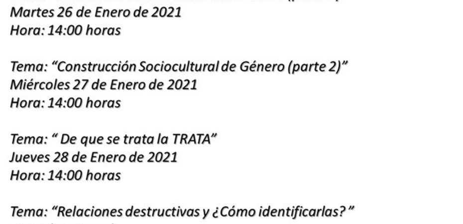 En tanto, el jueves 28 de enero, los participantes ampliarán sus conocimientos sobre la temática “De que se trata la trata”, y el viernes 29, aprenderán sobre las “Relaciones destructivas y ¿Cómo identificarlas?”, sesión en la que se contará con una invitada especial.