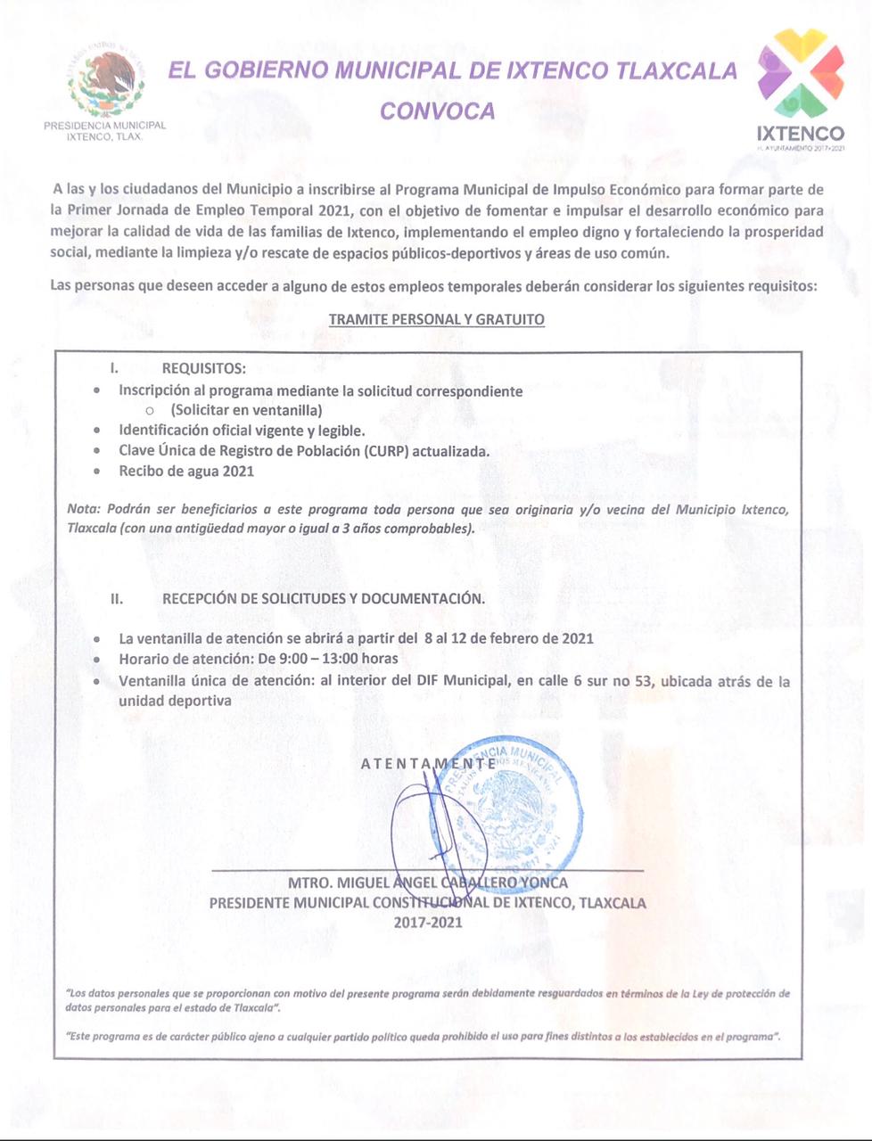 Con el objetivo de fomentar e impulsar el desarrollo económico para mejorar la calidad de vida de las familias de Ixtenco, el Gobierno Municipal, que encabeza Miguel Ángel Caballero Yonca, anunció la primera jornada de empleo temporal de este 2021.