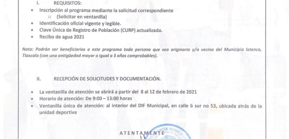 La ventanilla de atención para la recepción de solicitudes y documentación se abrirá a partir del 8 al 12 de febrero, el horario de atención será de 9 a 13 horas en las instalaciones que ocupa el nuevo DIF de Ixtenco, los solicitantes deberán respetar las medidas sanitarias de seguridad, como el uso correcto de cubrebocas, toma de temperatura, aplicación de gel antibacterial y sana distancia.