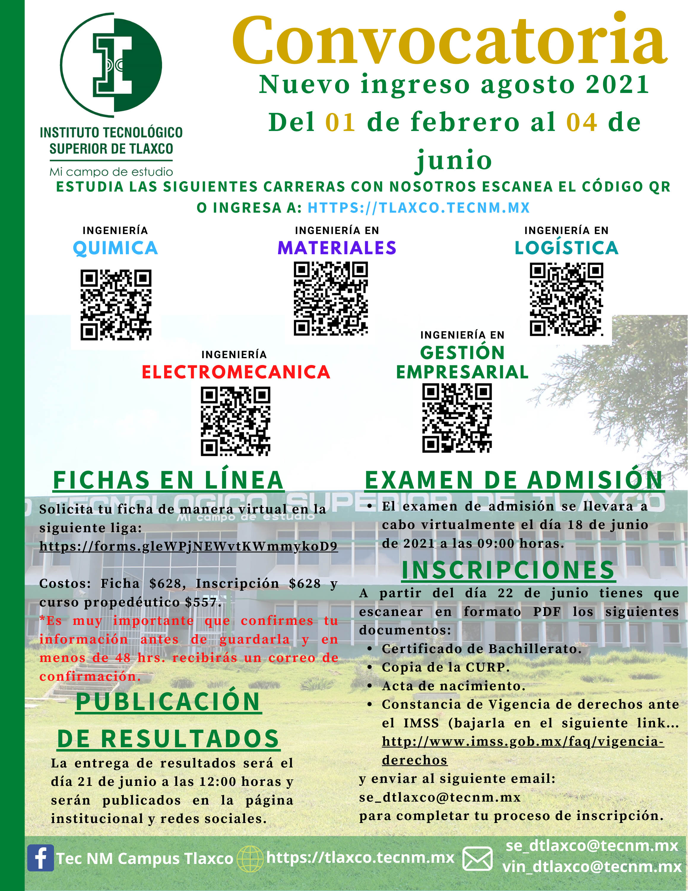 Actualmente, el Tecnológico Nacional de México Campus Tlaxco ofrece las ingenierías en: Química, Materiales, Logística, Electromecánica y Gestión empresarial; el proceso de admisión 2021 será completamente en línea a través de la página https://tlaxco.tecnm.mx/, mediante un trámite fácil y sencillo.