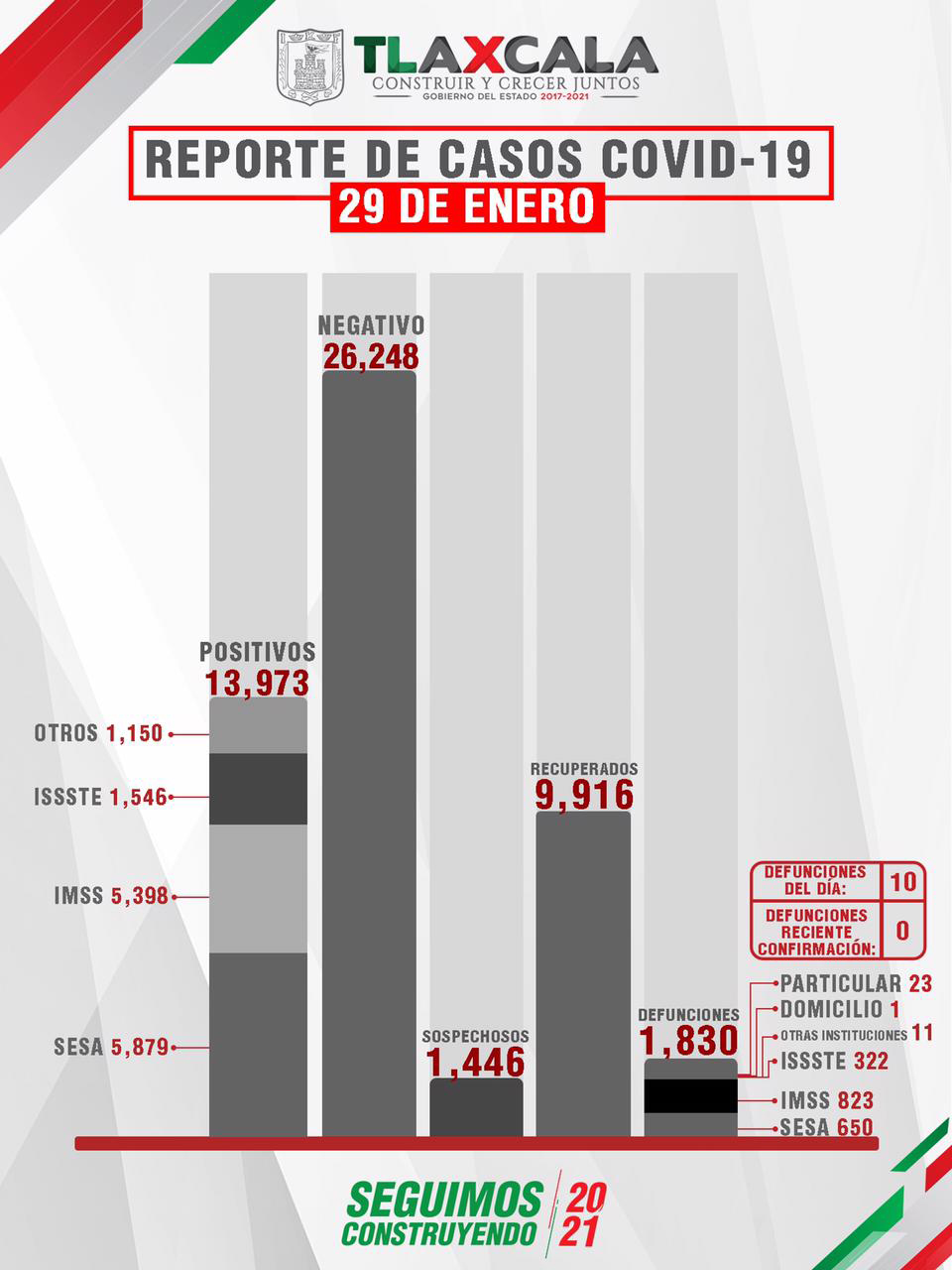 De acuerdo con el reporte del 29 de enero, la Secretaría de Salud del Estado (SESA) confirmó 233 personas recuperadas, 10 fallecimientos y 109 casos positivos de Covid-19 de tlaxcaltecas identificados en el estado y 1 en otra entidad.