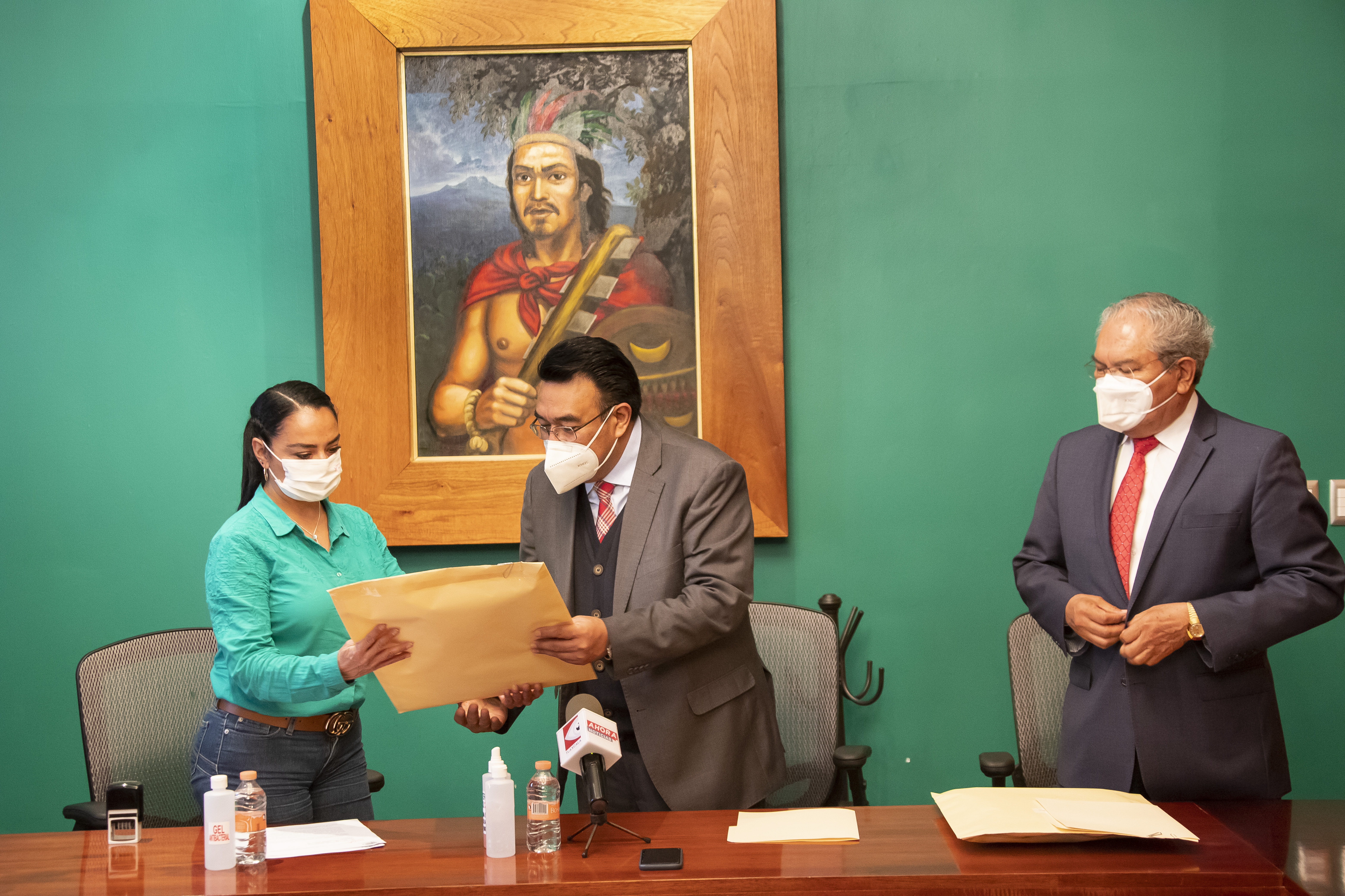 José Aarón Pérez Carro, Secretario de Gobierno, acompañado por Ramón Rafael Rodríguez Mendoza, Consejero Jurídico del Ejecutivo, fue el encargado de entregar las ternas a la Presidenta de la Mesa Directiva del Congreso Local, la Diputada Mayra Vázquez Velázquez.