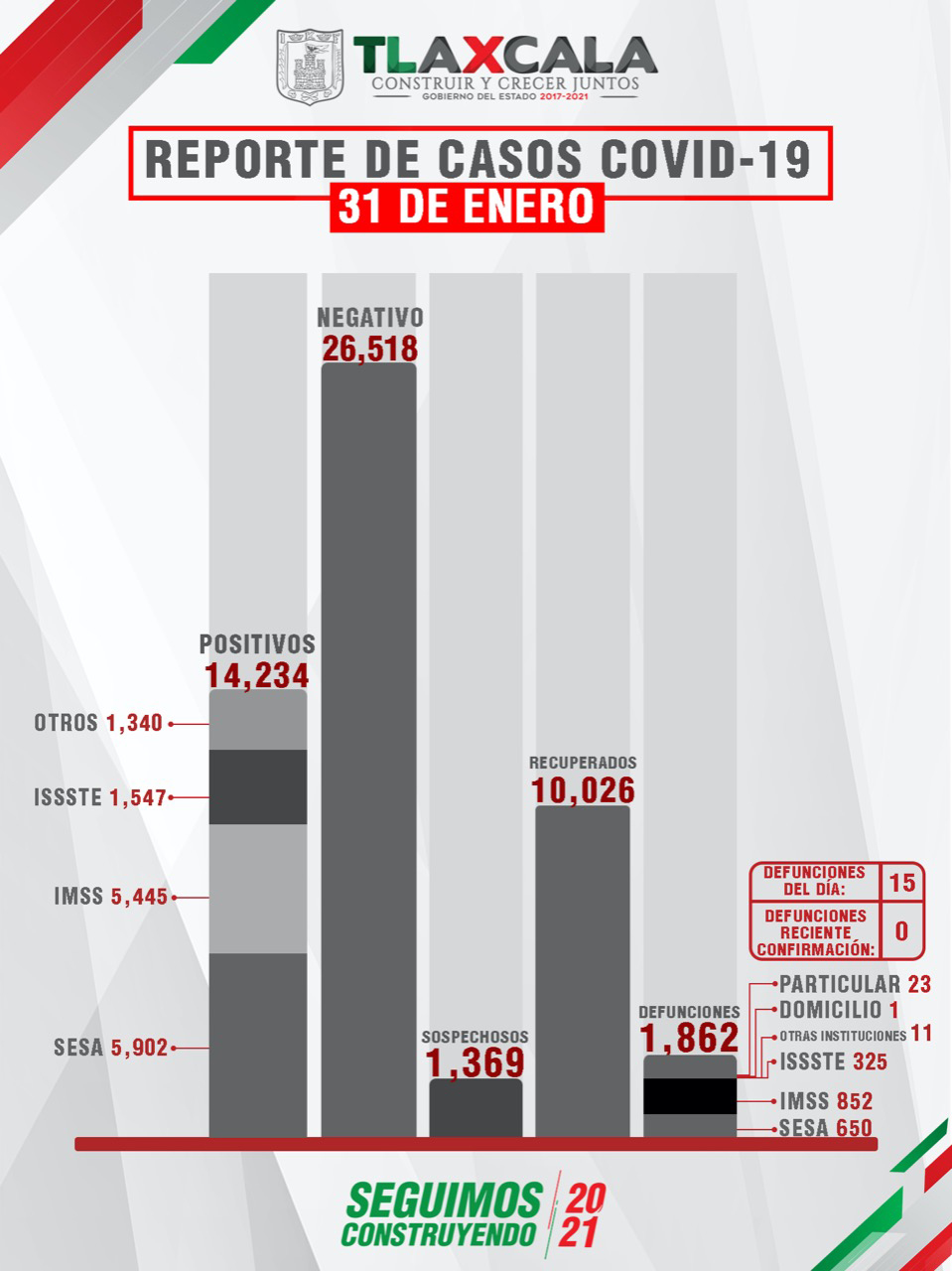 De acuerdo con el reporte del 31 de enero, la Secretaría de Salud del Estado (SESA) confirmó 50 personas recuperadas, 15 fallecimientos y 123 casos positivos de Covid-19 de tlaxcaltecas identificados en el estado.