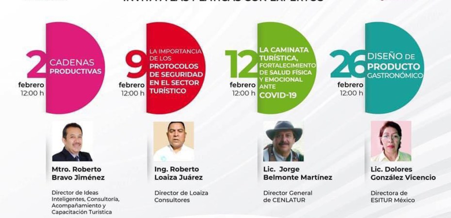 Cabe señalar que el pasado 2 de febrero se impartió la plática “Cadenas Productivas” a cargo de Roberto Bravo Jiménez, Director de Ideas Inteligentes, Consultoría, Acompañamiento y Capacitación Turística, mientras que este 9 de febrero se abordó el tema “La importancia de los protocolos de seguridad en el sector turístico” a cargo de Roberto Loaiza Juárez, Director de Loaiza Consultores.
