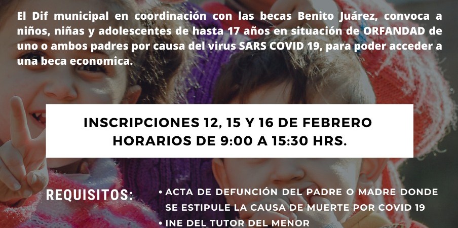 El Gobierno Municipal de Ixtenco que encabeza Miguel Ángel Caballero Yonca, a través del DIF Municipal y en coordinación con las Becas Benito Juárez, anunciaron que a partir del día de mañana 12 de febrero, se abrirán las inscripciones para que niños, niñas y adolescentes hasta los 17 años, en situación de orfandad a causa del virus SARS-CoV2, podrán acceder a una beca económica.