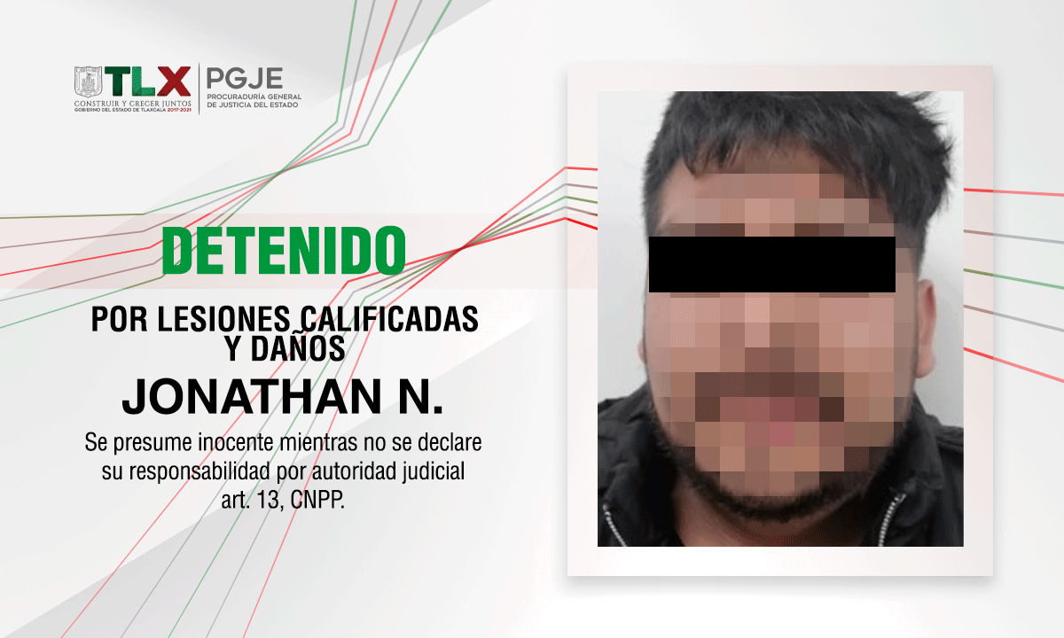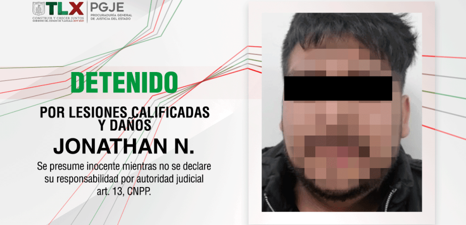 La Procuraduría General de Justicia del Estado (PGJE) a través del Agente del Ministerio Público, mantiene en calidad de detenido y bajo investigación a una persona del sexo masculino por el delito de lesiones calificadas y daños, luego de que agredió físicamente a personal de la Coordinación Estatal de Protección Civil (CEPC) y dañó una unidad oficial durante el operativo de revisión de hoteles y moteles en Ixtacuixtla.