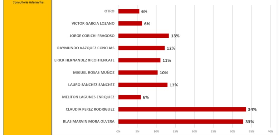 La “Consultoría Adamantis”, dio a conocer una encuesta realizada en la capital del Estado de Tlaxcala, con la finalidad de saber las preferencias electorales de los ciudadanos, en específico, sobre el “posicionamiento de precandidatos a la presidencia municipal por el partido político MORENA”, en la cual se destaca la presencia de dos personas, una es mujer y la otra es un joven político.