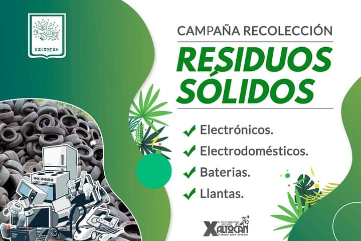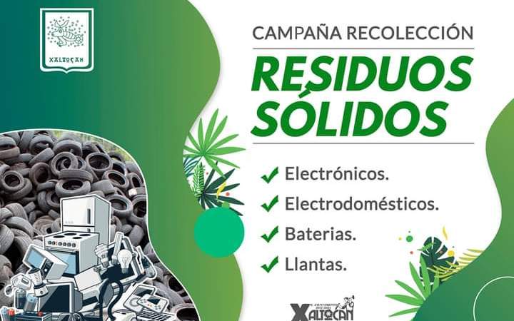 El Presidente municipal de Xaltocan, Eugenio Sánchez Amador, y el Ayuntamiento invitan a la población en general a unirse a la campaña de recolección de reciduos Sólidos 2021, que consiste en llevar la basura electrónica, como, computadoras viejas, celulares, electrodomésticos, reproductores de MP3, memorias USB, impresoras, baterías, etcétera a tu presidencia de comunidad, también podras llevar llantas viejas.
