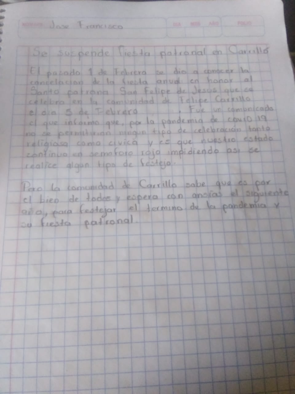 La comunidad de Carrillo sabe que es por el bien de todos los ciudadanos la cancelación de dicha festividad, esperando que el próximo año se pueda realizar la celebración y espera con ansias que la pandemia pase y se regrese a la vida cotidiana que les permita este tipo de reuniones y celebraciones patronales.