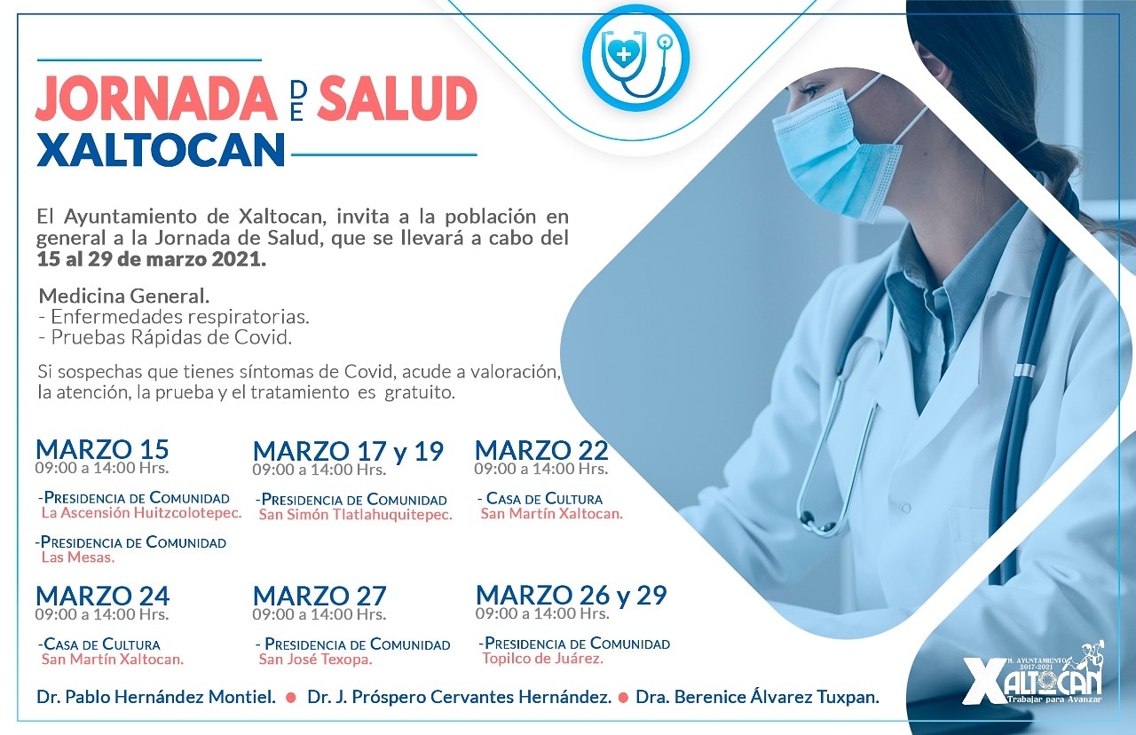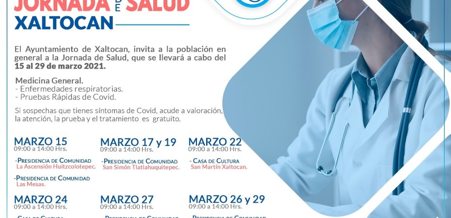 El gobierno municipal de Xaltocan invita a la población en general a la Jornada de salud que se llevará a cabo del 15 al 29 de marzo 2021