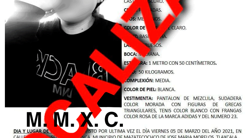 La denuncia de no localización fue interpuesta por la madre de la víctima ante el Agente del Ministerio Púbico, quien manifestó que su hija de iniciales M.M.X.C., de 18 años de edad, fue vista por última vez al salir de su domicilio el 5 de marzo del año en curso en el municipio de Mazatecochco.