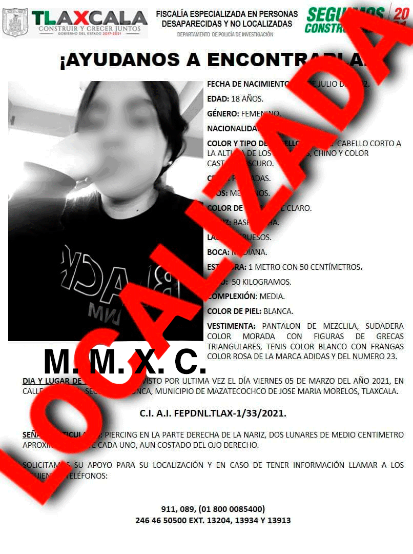 Tras varias investigaciones, M.M.X.C., fue localizada en el estado de Guerrero; asimismo, luego de ser presentada ante el Representante Social de Tlaxcala, declaró que salió de su casa por voluntad propia.