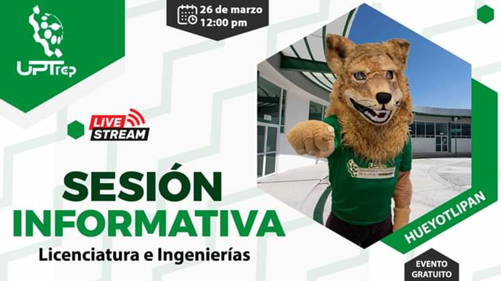 La Universidad Politécnica de Tlaxcala Región Poniente (Uptrep) invita a estudiantes a la «Sesión Informativa Licenciatura e Ingenierías» que realizará, este viernes 26 de marzo, a través de la plataforma Facebook Live y YouTube para dar a conocer su oferta educativa.