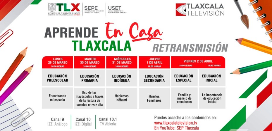 El Gobierno del Estado, a través de la Coordinación de Radio, Cine y Televisión de Tlaxcala (Coracyt) retransmitirá en el canal local de Tlaxcala Televisión los primeros 12 programas de “Aprende en Casa Tlaxcala”, del 29 de marzo al 2 de abril y del 5 al 9 de abril, en el horario habitual de las 16:00 horas, informó la Secretaría de Educación Pública del Estado (SEPE).