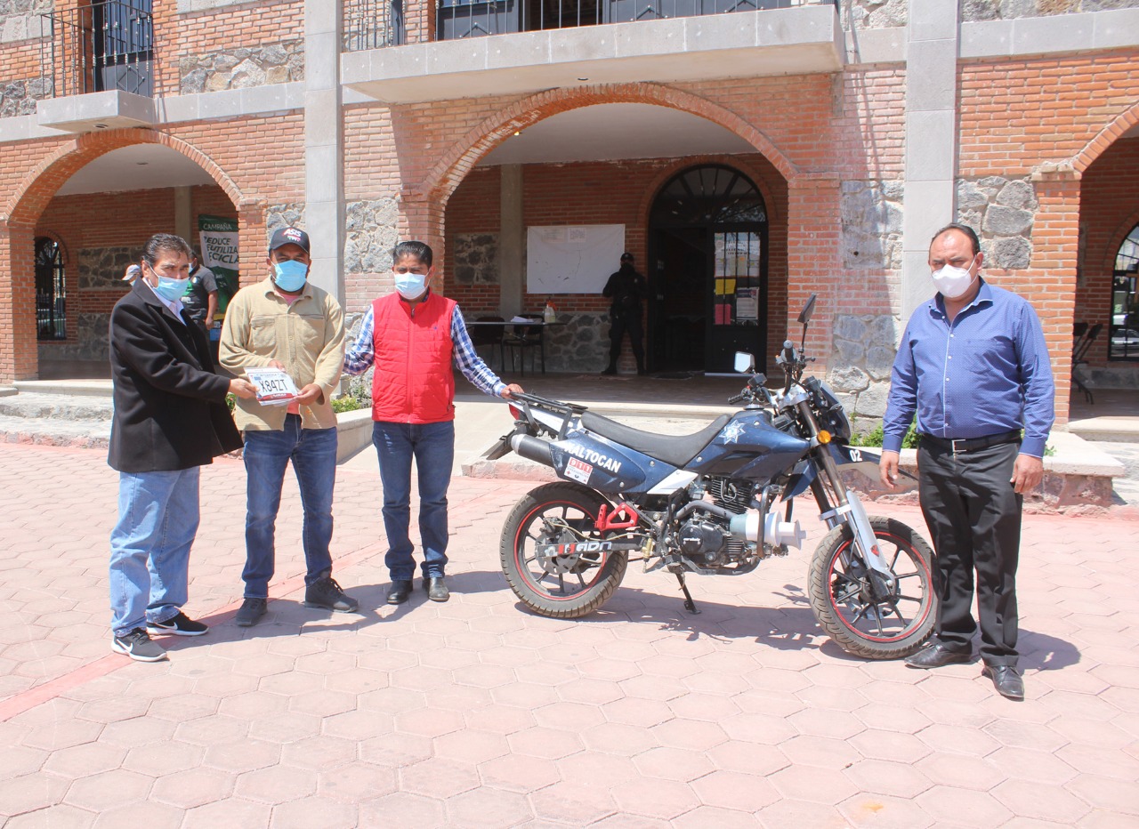 Eugenio Sánchez Amador hace entrega de una moto al comité de agua potable de San Simón Tlatlahuquitepec