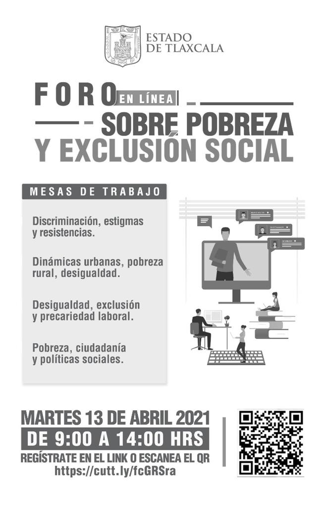 La Secretaría de Políticas Públicas y el Sistema Estatal de Promoción del Empleo (Sepol-Sepuede) organizarán el foro en línea sobre Pobreza y Exclusión Social, previsto para el martes 13 de abril, de las 9:00 a las 14:00 horas, el cual estará dirigido a servidores públicos y población en general.