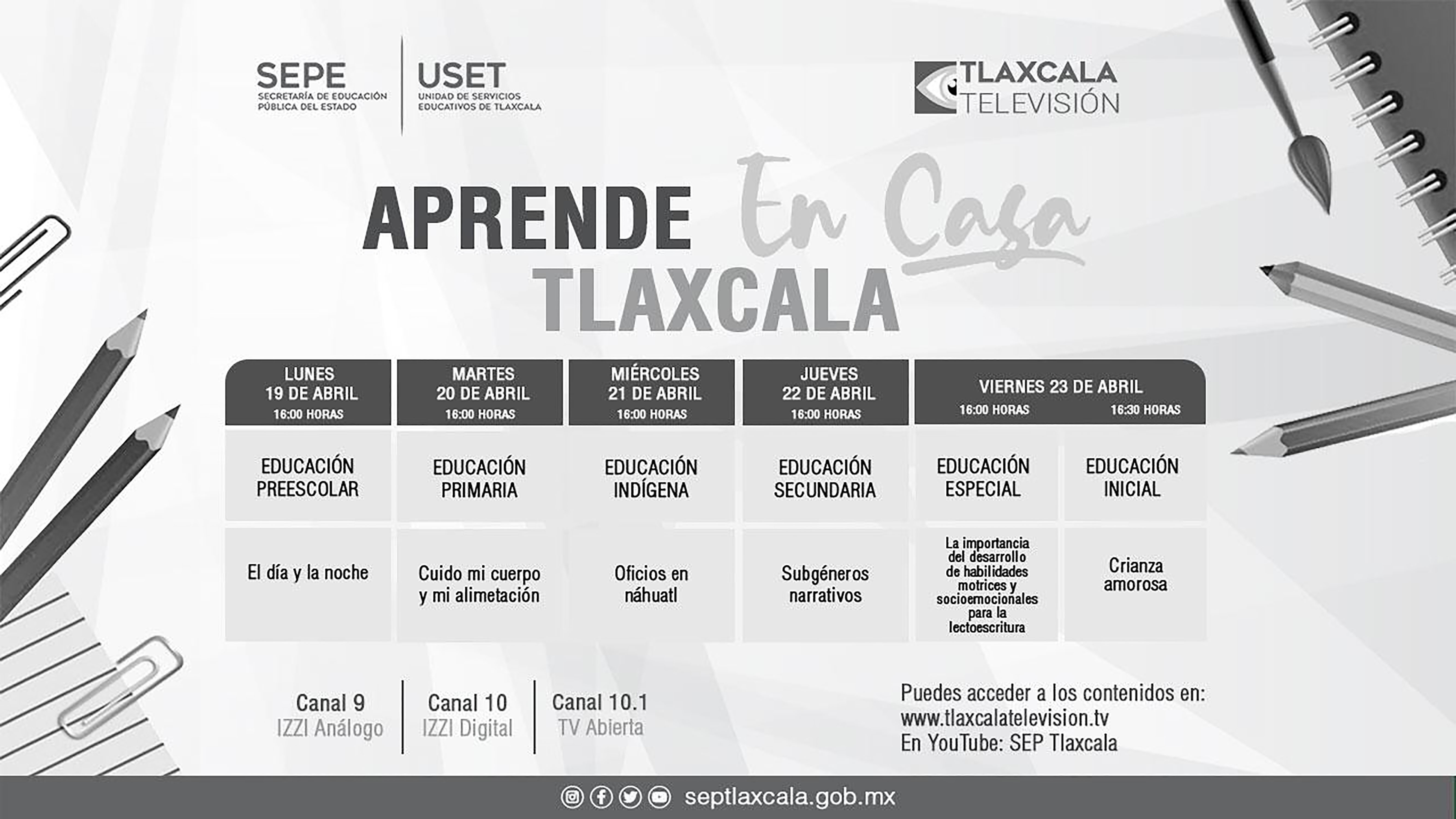 La Secretaría de Educación Pública del Estado (SEPE) dio a conocer la barra temática de “Aprende en Casa Tlaxcala”, que comprende del 19 al 23 de abril, y que se transmitirá por el canal de Tlaxcala Televisión, de las 16:00 a 16:30 horas.
