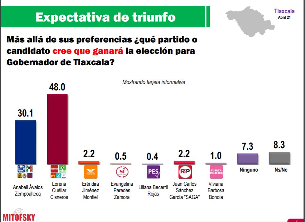 De acuerdo al último estudio realizado por la prestigiada casa encuestadora Mitofsky, entre el 13 y el 16 de abril del 2021, las preferencias electorales favorecen Lorena Cuéllar y a MORENA rumbo a la elección del próximo 6 de junio, en la cual los tlaxcaltecas renovarán la gubernatura del estado.