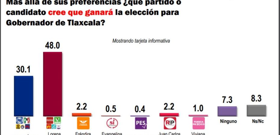 La misma encuesta, que se puede ver completa en el siguiente enlace http://consulta.mx/index.php/encuestas-e-investigaciones/elecciones/item/1443-tlaxcala-tendencias21, revela que ante la pregunta «Más allá de las preferencias ¿qué partido o candidato cree que ganará la elección para gobernador de Tlaxcala?» el 48 por ciento de los tlaxcaltecas entrevistados contestaron que MORENA y Lorena Cuéllar, mientras que sólo el 30 por ciento dijo que Anabell Ávalos y el PRI, en tanto que el 15.6% de los tlaxcaltecas aún no definen o no mencionan el sentido de su preferencia.
