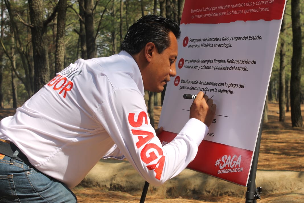 Juan Carlos Sánchez García, SAGA, candidato a la gubernatura del estado de Tlaxcala por el partido Redes Sociales Progresistas, firmó en este día mundial de la madre tierra, su quinto compromiso de gobierno en el que se establece la recuperación de ríos y cuerpos de agua, así como los bosques de la entidad.
