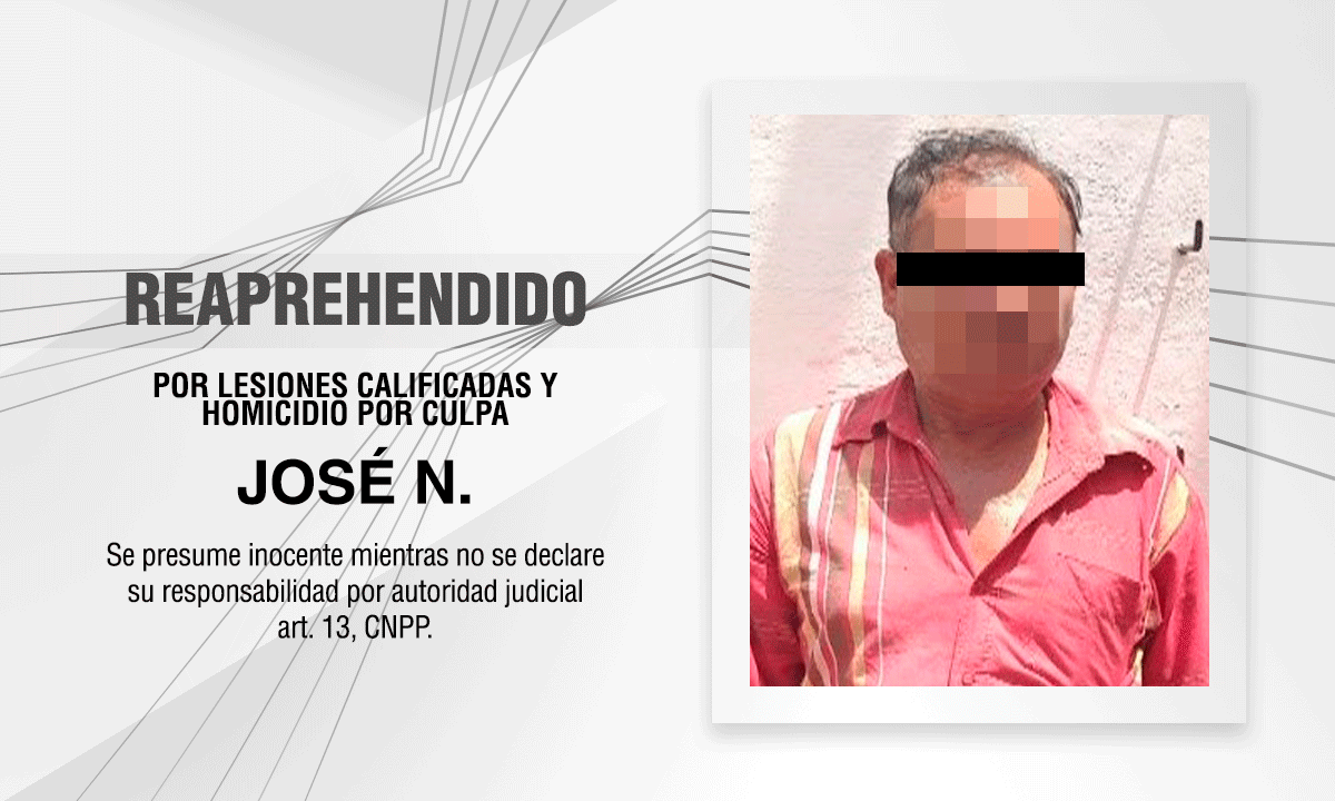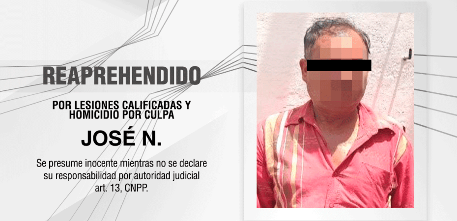 Resultado de las estrategias jurídicas y procesales del grupo de agentes del Ministerio Público de la Procuraduría General de Justicia del Estado (PGJE), se logró la reaprehensión de José N., quien cuenta con un proceso en su contra por el delito de lesiones y homicidio por culpa.