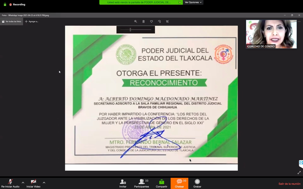 Al concluir su participación el Maestro Alberto Domingo Maldonado Martínez, recibió por conducto de la titular de la Unidad de Igualdad de Género del Poder Judicial, Patricia Eunice Vázquez Bernal, un reconocimiento por su participación.