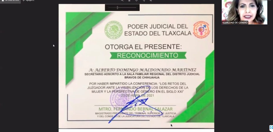 Al concluir su participación el Maestro Alberto Domingo Maldonado Martínez, recibió por conducto de la titular de la Unidad de Igualdad de Género del Poder Judicial, Patricia Eunice Vázquez Bernal, un reconocimiento por su participación.