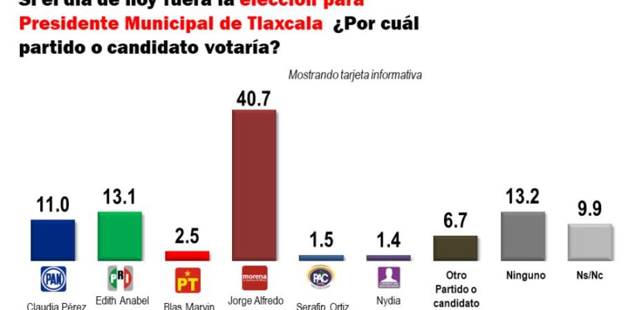El morenista Jorge Corichi se consolida en la preferencia de posibles votantes en la capital de Tlaxcala al obtener 40.7% de la intención del voto a su favor. Un sondeo bien realizado, profesional, demuestra que ni sumando todos sus porcentajes las y los aspirantes del PRI; PAN, PAC, PRD e independiente podrían superarlo ya que únicamente llegan al 29.5%.