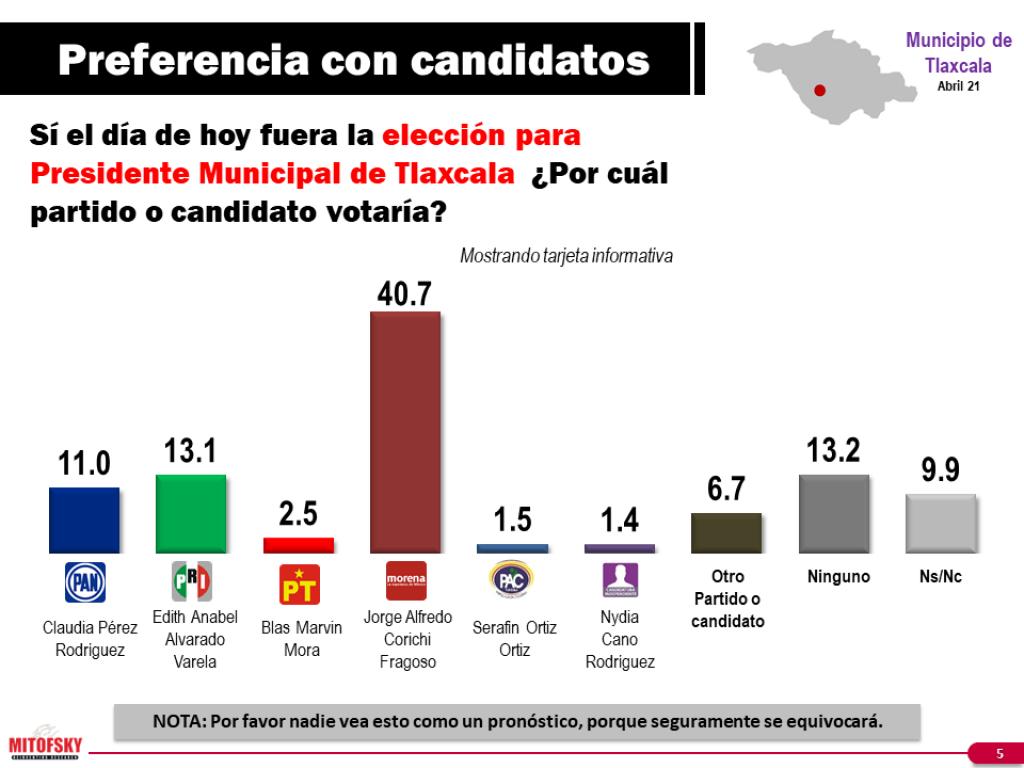 Consulta Mitofsky, de Roy Campos, realizó un estudio de casa en casa, preguntando a los habitantes de la capital en edad electoral y con credencial del Insituto Nacional Electoral, las preferencias electorales hacia la contienda de la presidencia municipal de Tlaxcala.