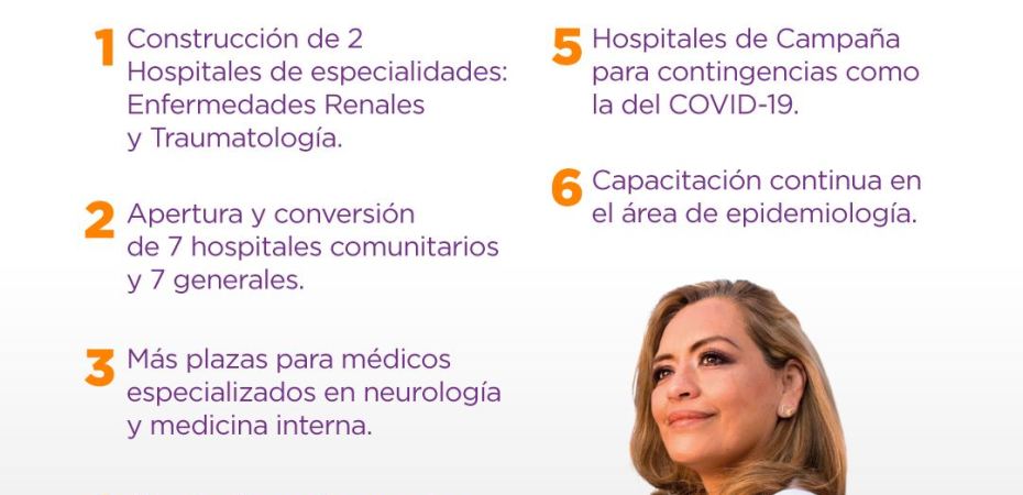 Entre sus 6 primeros compromisos con el sector salud, destaca la creación de 2 hospitales de especialidades, así como la apertura y conversión de 7 hospitales hospitales generales y 7 comunitarios.