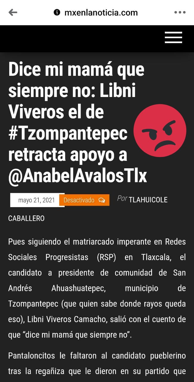 En medio de una guerra sucia de dimes y diretes, una publicación del portal Mx en la Noticia titulado «Dice mi mamá que siempre no: Libni Viveros el de #Tzompantepec retracta apoyo a @AnabelAvalosTlx», se puede observar que en primer párrafo el escritor plasma: