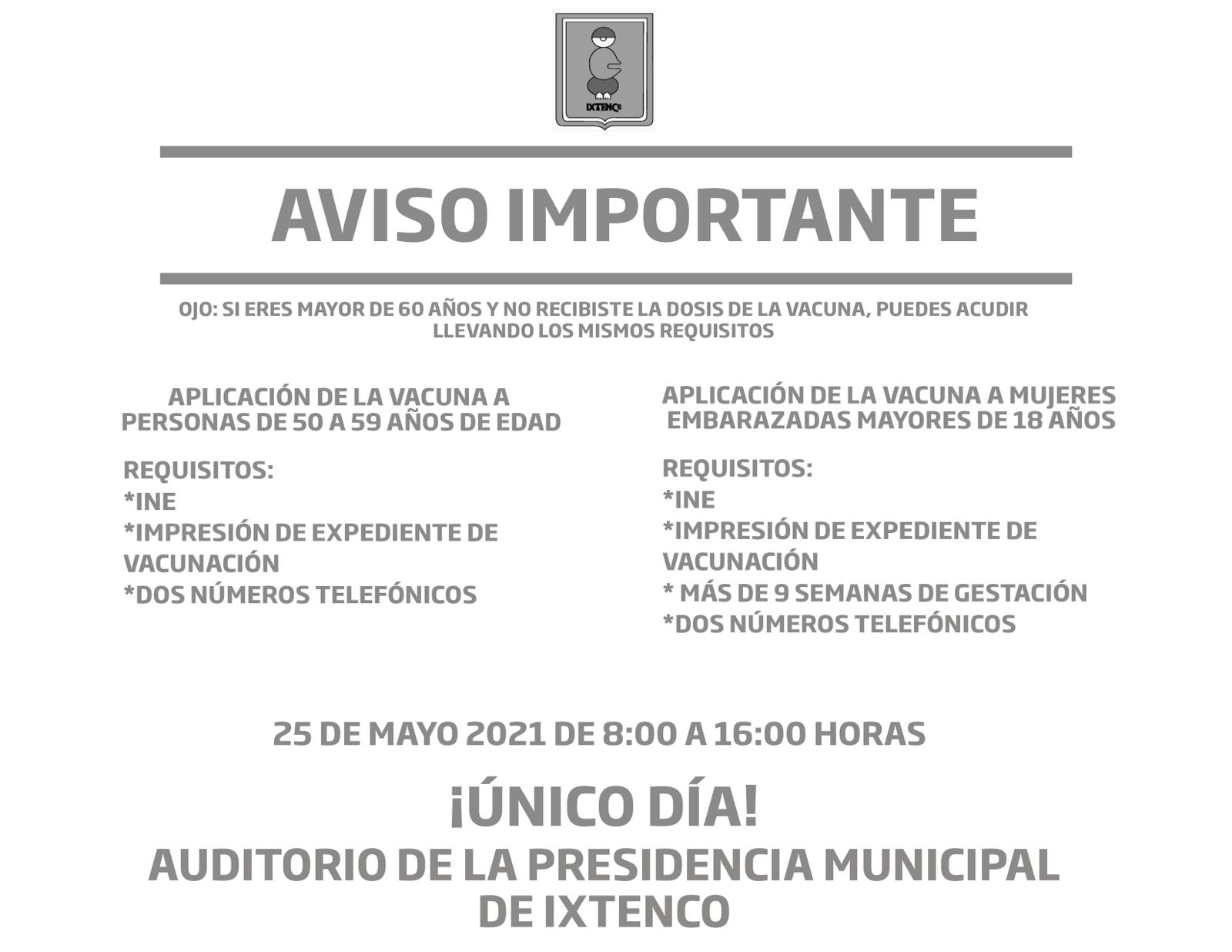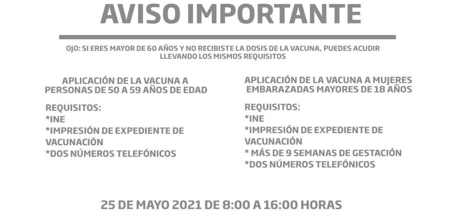 El día de mañana, martes 25 de Mayo iniciará a las 8:00 horas la vacunación a los adultos de 50 a 59 años de edad.