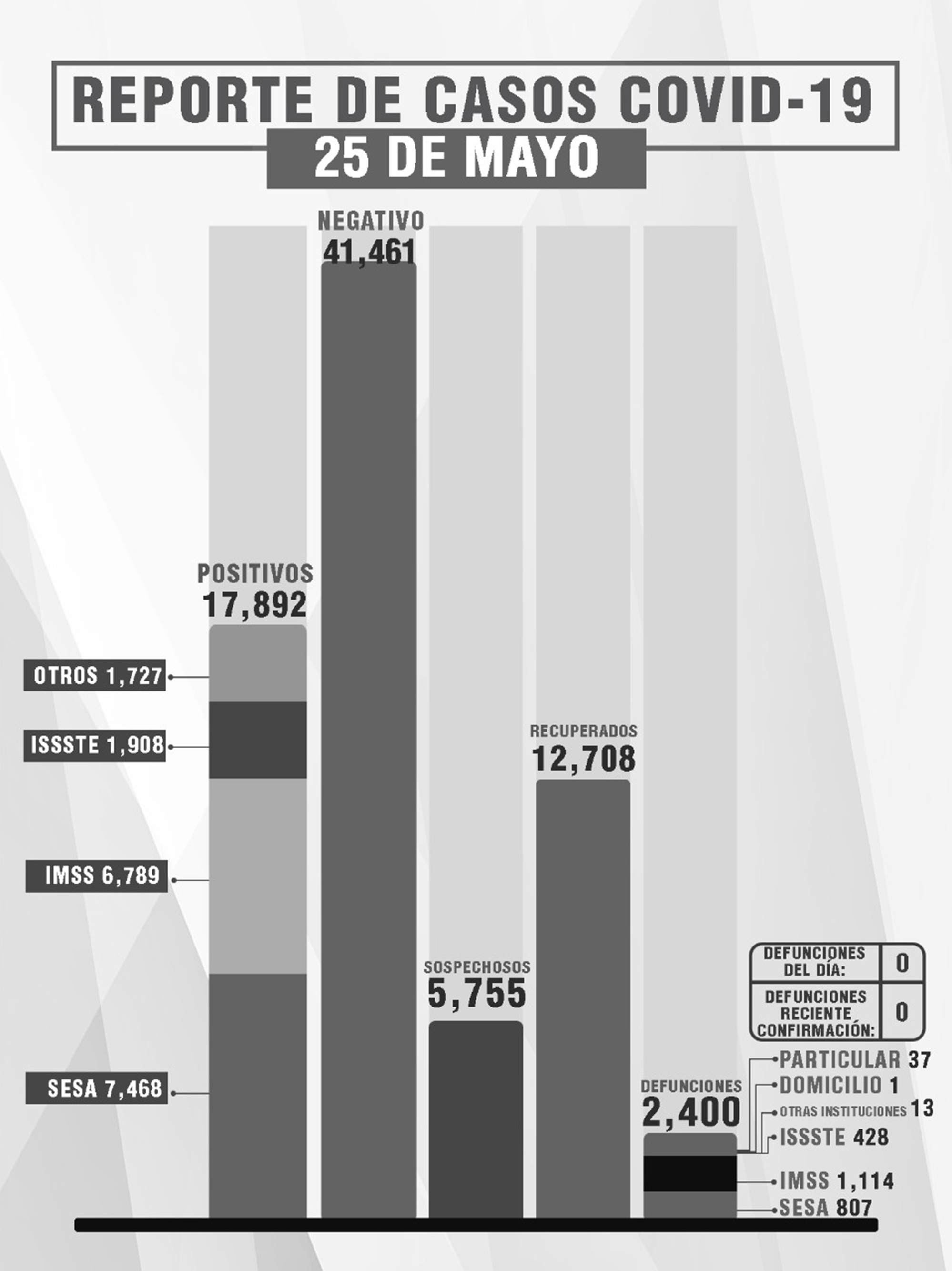 De esta manera, el estado registra 12 mil 708 personas recuperadas, 17 mil 892 casos positivos y dos mil 400 fallecimientos.