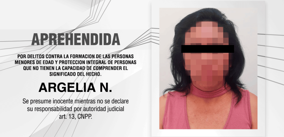 La Procuraduría General de Justicia del Estado (PGJE) logró identificar y aprehender a Argelia N., como probable responsable del delito contra la formación de las personas menores de edad y protección integral de personas que no tienen la capacidad de comprender el significado del hecho.