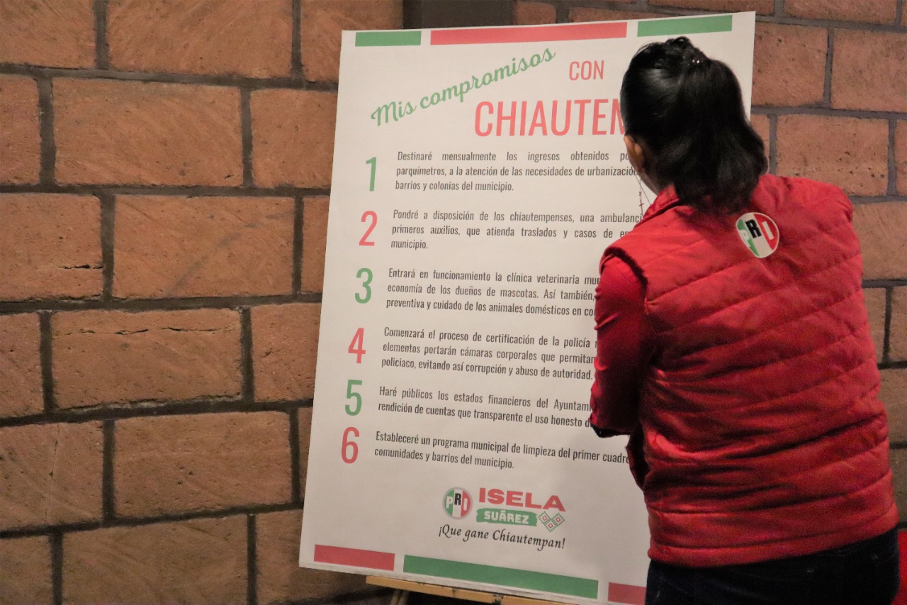 La candidata por el Partido Revolucionario Institucional (PRI) a la alcaldía de Chiautempan, Isela Suárez Flores firmó este martes 01 de junio un total de 6 compromisos de campaña enfocados a los rubros de salud, seguridad, urbanización, bienestar y transparencia, cerrando de esta manera su campaña proselitista.