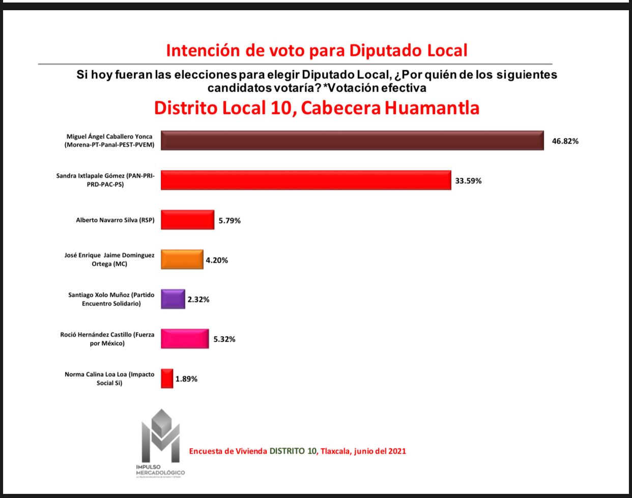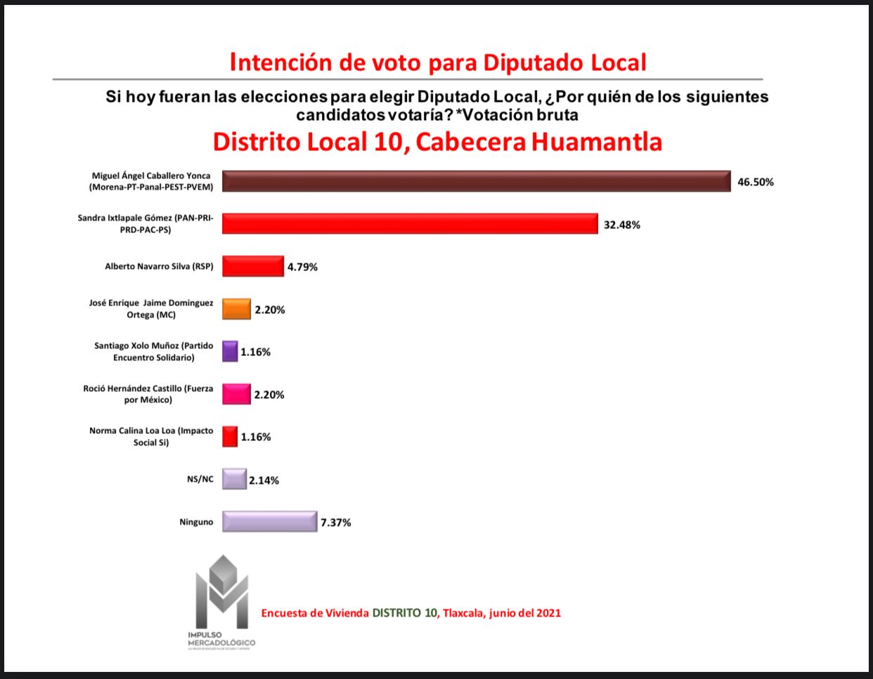 La más reciente encuesta publicada en su portal de internet, de la empresa encuestadora Impulso Mercadológico, da a Morena una preferencia del 46.5%, en el caso de la diputación local por el decimo distrito de Tlaxcala encabezada por Miguel Ángel Caballero Yonca, mientras que el PRI tiene 32.48% y el más cercano contendiente es del RSP con 4.70 % de la intenciòn del voto.